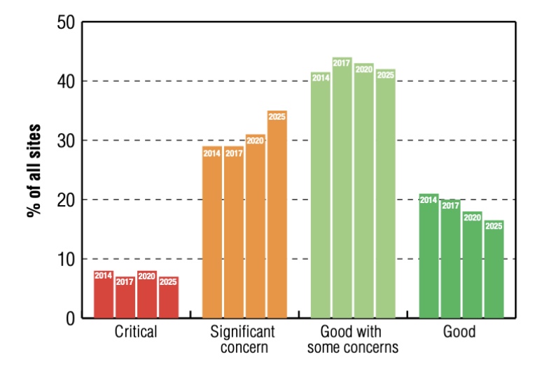 À partir de ces trois paramètres, le rapport détermine une évaluation globale de chaque site, allant de favorable à critique. Selon les données comparatives de l’UICN portant sur 228 sites évalués depuis 2014, le rapport révèle une baisse inédite des perspectives de conservation positives. Alors que 63 % des sites affichaient encore une situation favorable en 2014 et 2017, puis 62% en 2020, ils ne sont plus que 57 % en 2025. Cette dégradation s’accompagne d’une hausse des sites jugés en « préoccupation importante », passés de 31 % à 35 %. Il y a également une diminution du pourcentage de sites évalués comme « bons » (de 18 % en 2020 à 15 % en 2025) ou « bons avec quelques préoccupations » (de 44 % en 2020 à 42 % en 2025).